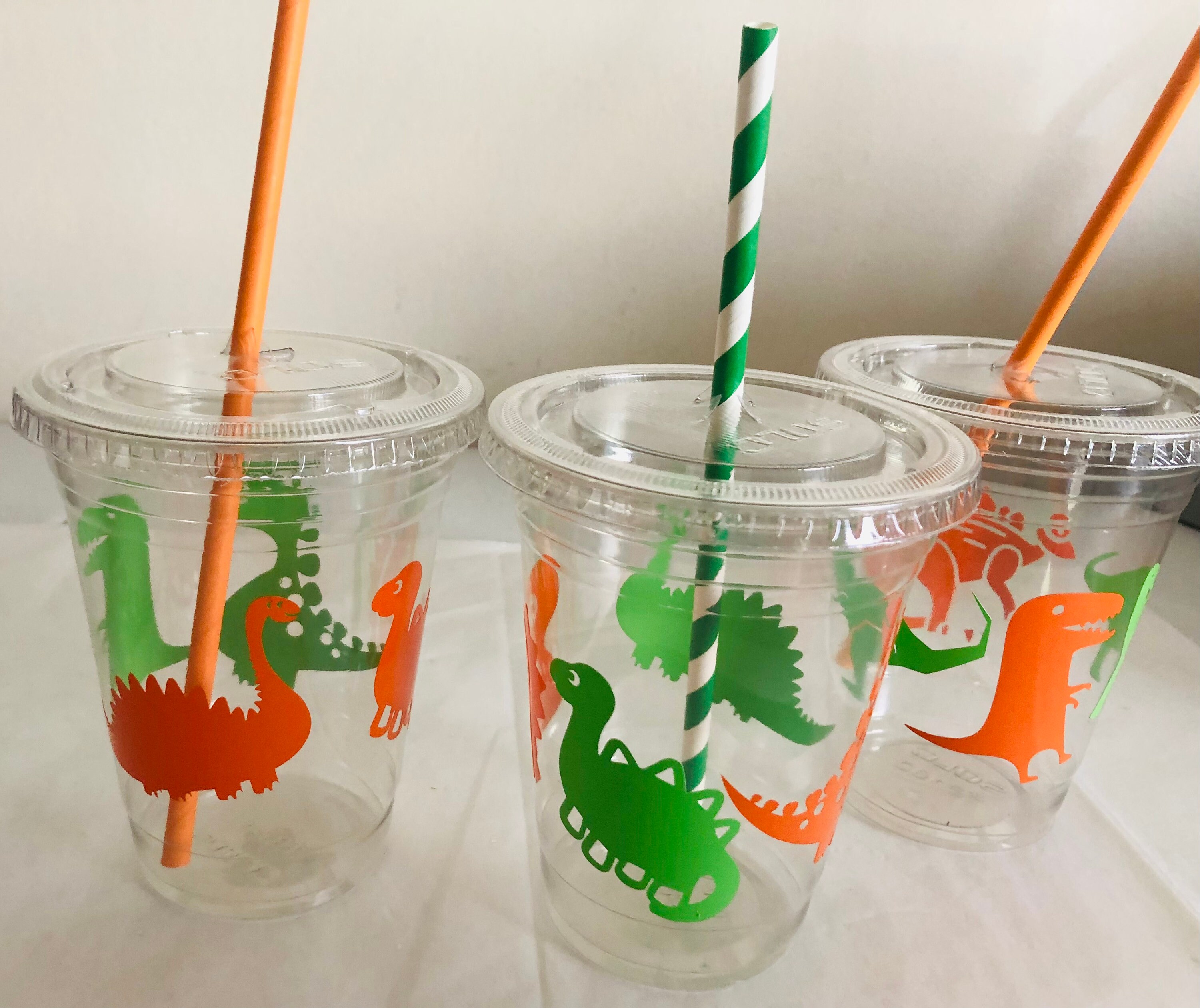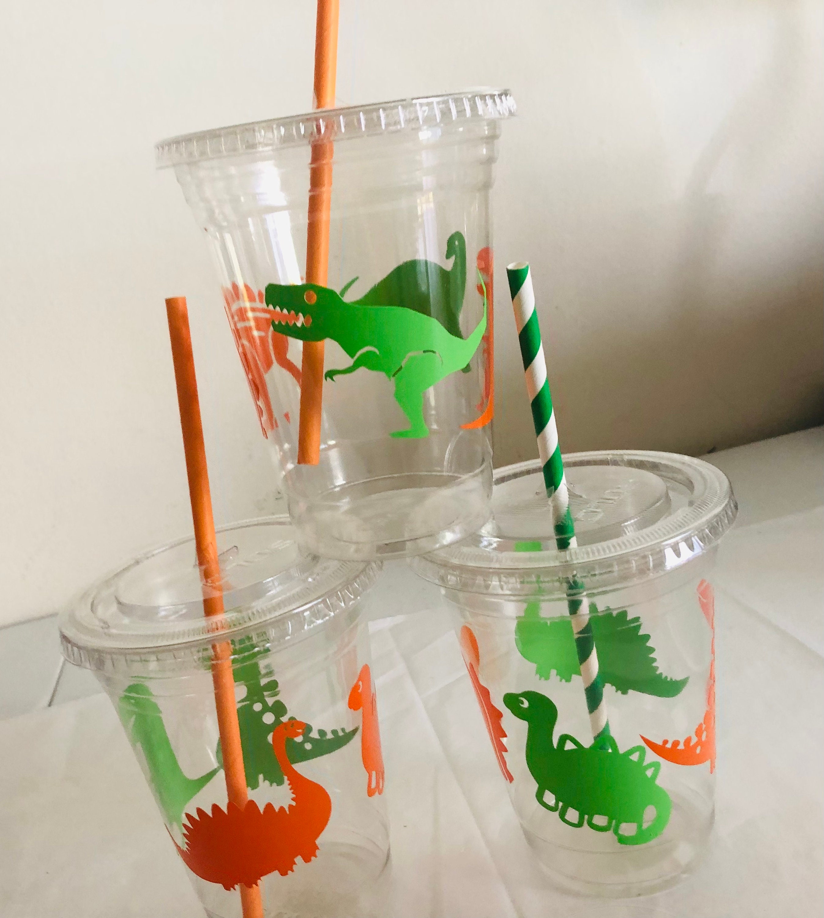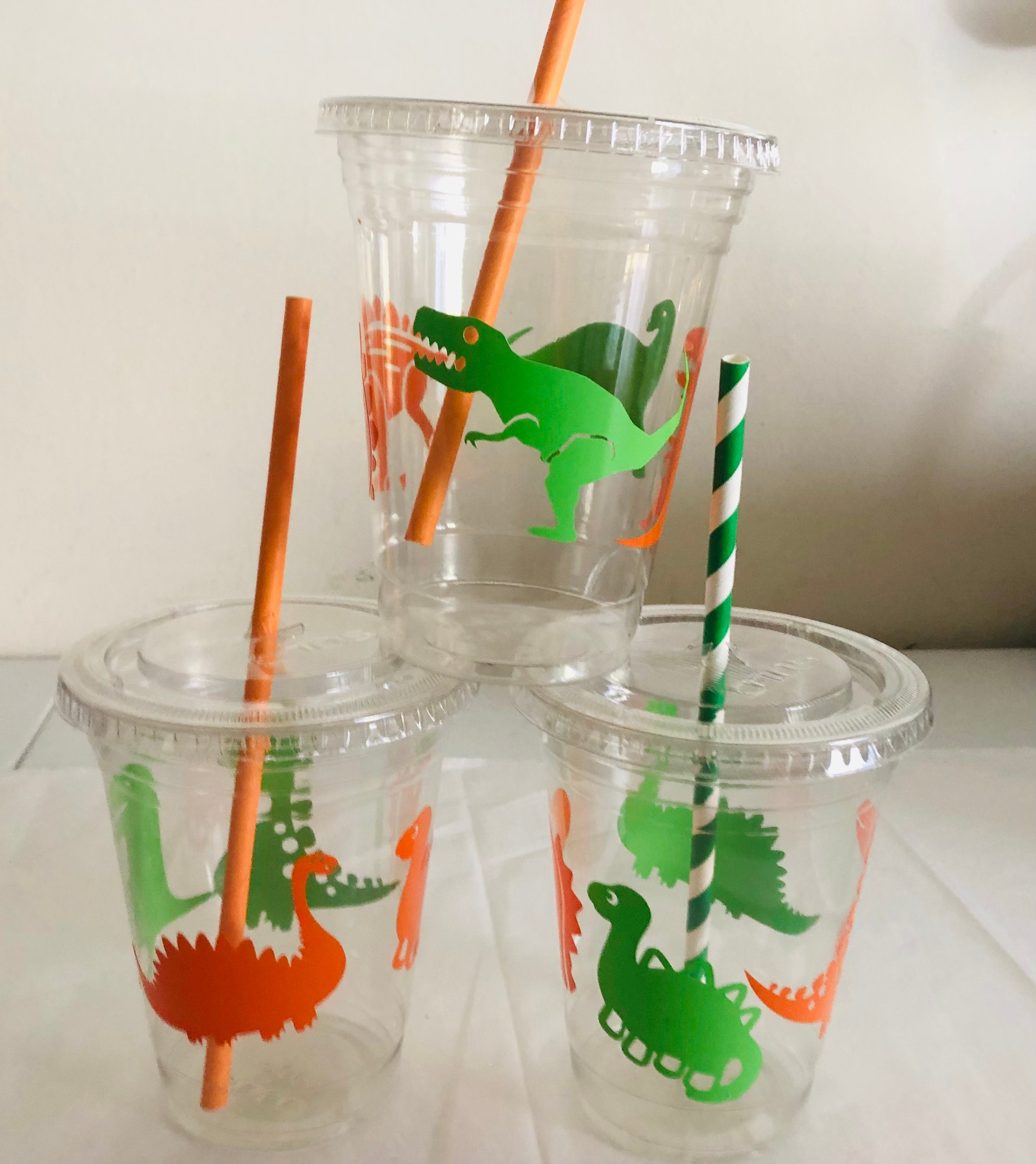 Dinosaur Birthday Party Cups: 16 oz Recyclable Plastic with Straws