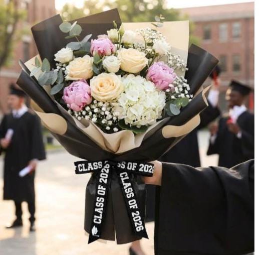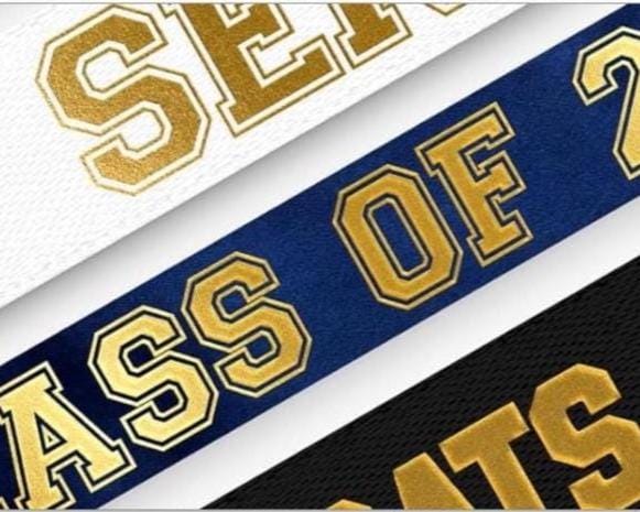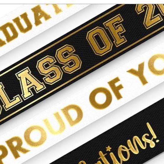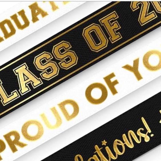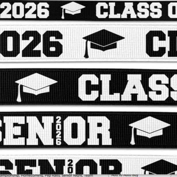 Class of 2026 Ribbon for Gifts, Bouquets and more. Grosgrain ribbon printed with either gold, white or black depending upon choices from drop down menu. Mixed sizes of 5/8 inch and 7/8 inch. Yard lengths are on drop down menu, add as many as needed to cart, one at a time.