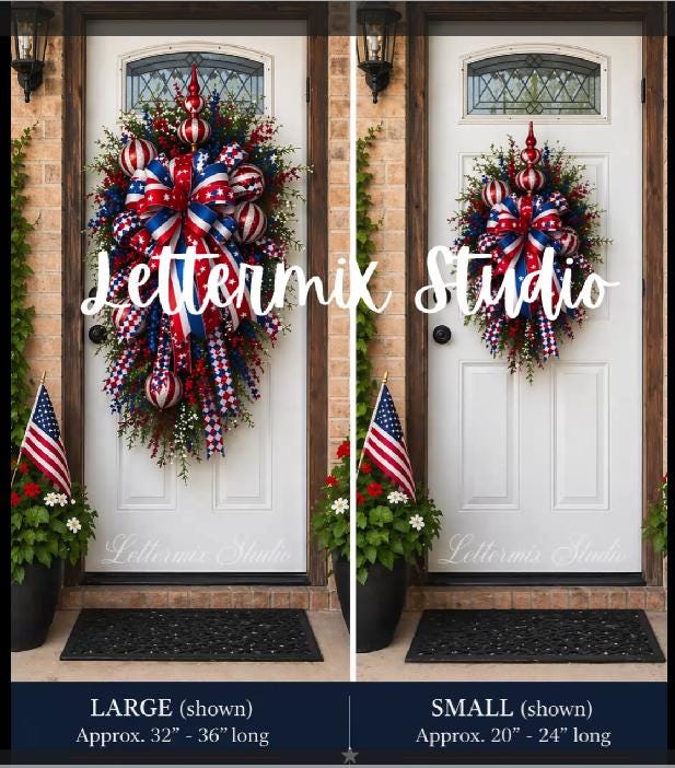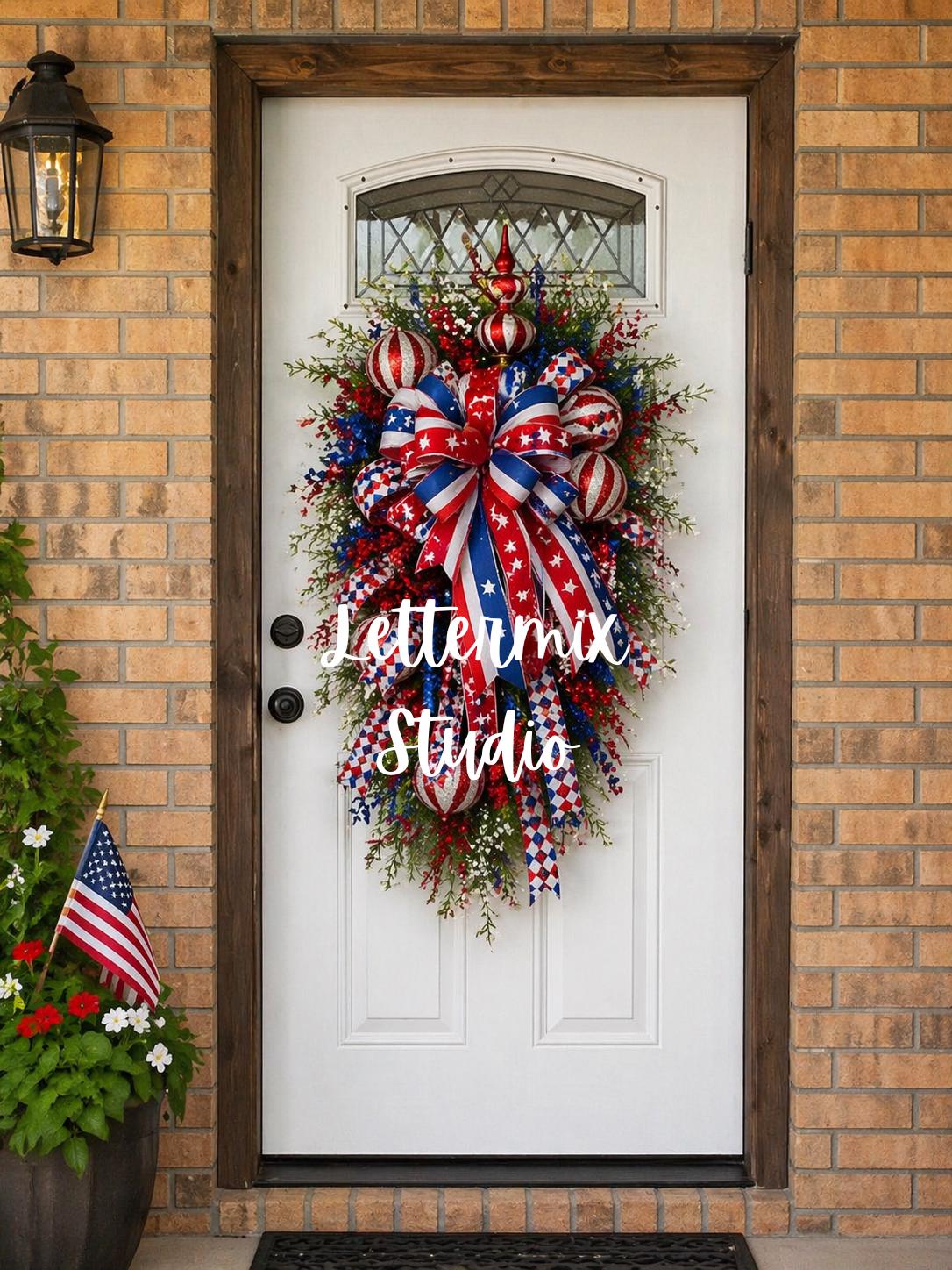 This handcrafted swag features a random vibrant mix of red, white, and blue ribbons, festive striped and glittered ornaments, all wreaths are unique, no two are the same, lush greenery for a full, high-end look. The oversized bow creates a stunning focal point, while the layered textures and sparkling details bring dimension and charm.