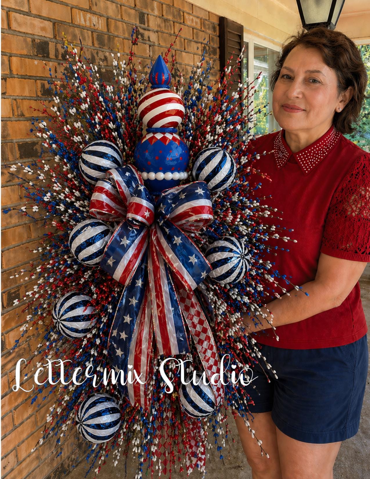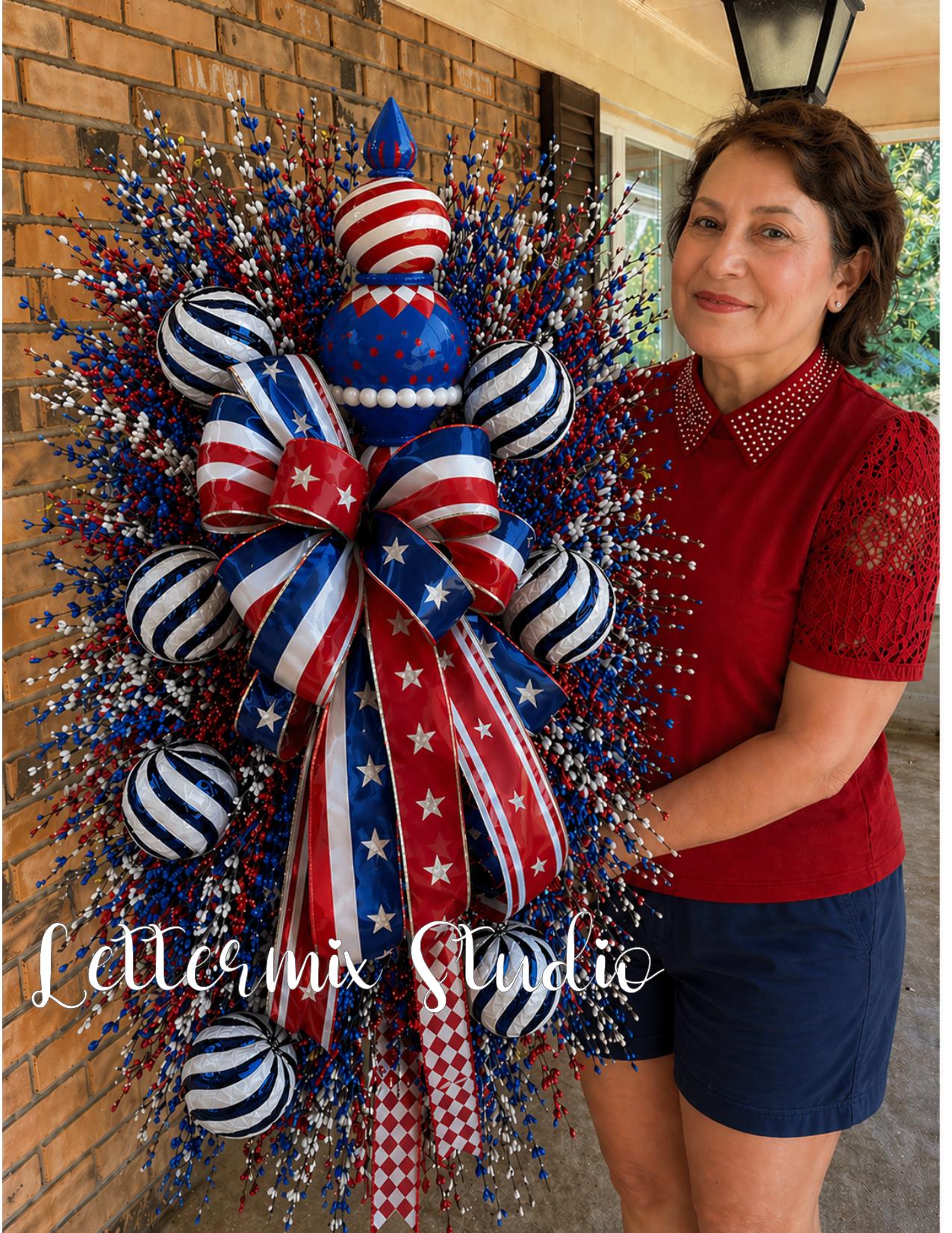This handcrafted swag features a random vibrant mix of red, white, and blue ribbons, festive striped and glittered ornaments, all wreaths are unique, no two are the same, lush greenery for a full, high-end look. The oversized bow creates a stunning focal point, while the layered textures and sparkling details bring dimension and charm.