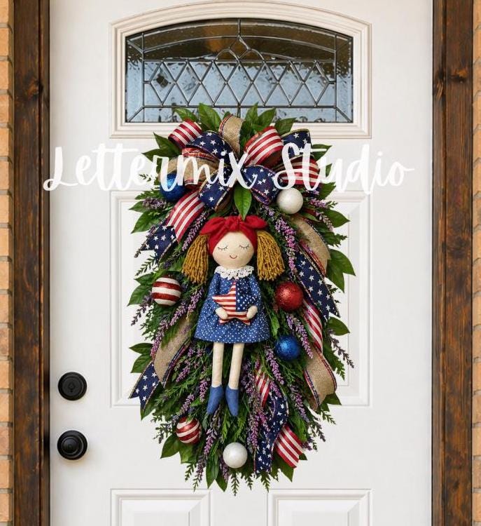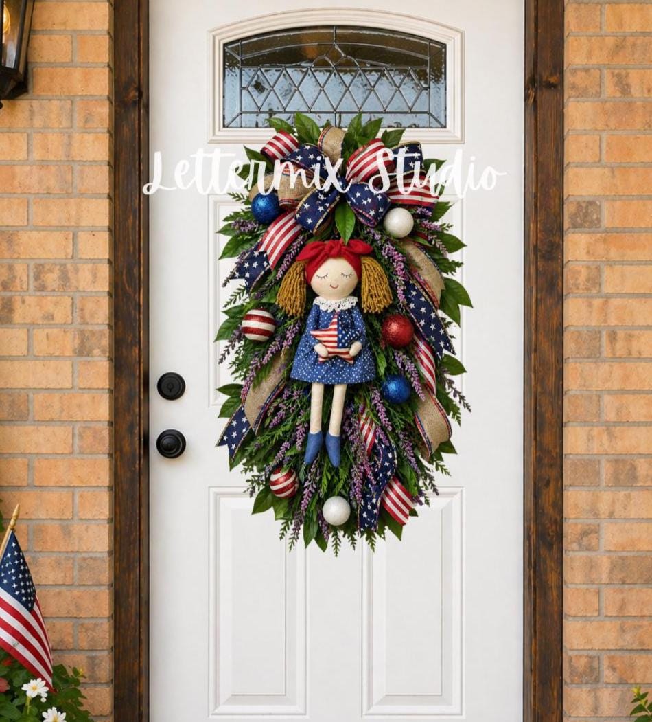 Vintage Doll Swag Wreath, Fourth of July Door Decor, Memorial Day