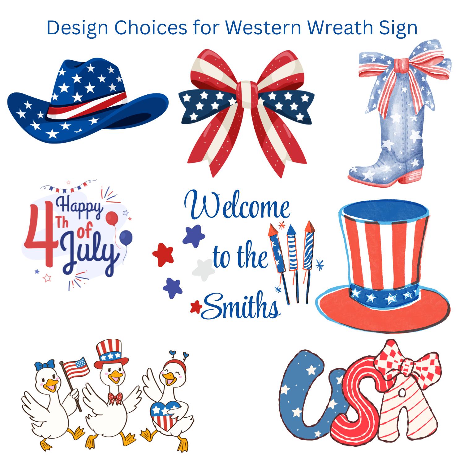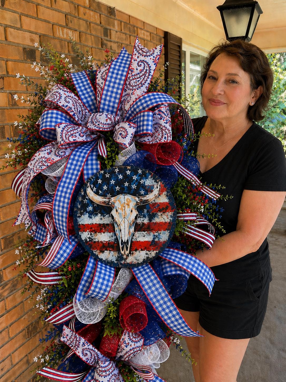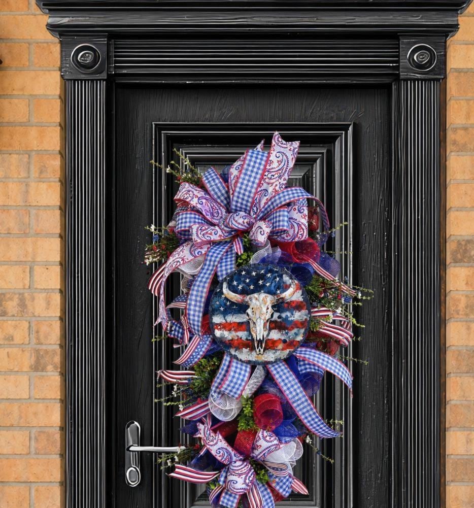 Designed with premium deco mesh and layered ribbons in striking red, white, and blue patterns—including plaid and paisley—this wreath brings texture, movement, and eye-catching dimension. The focal point in center, is an 8-inch round sign featuring a distressed longhorn skull over an American flag adds the perfect Western touch. Choose alternative style for sign or no sign on drop down.