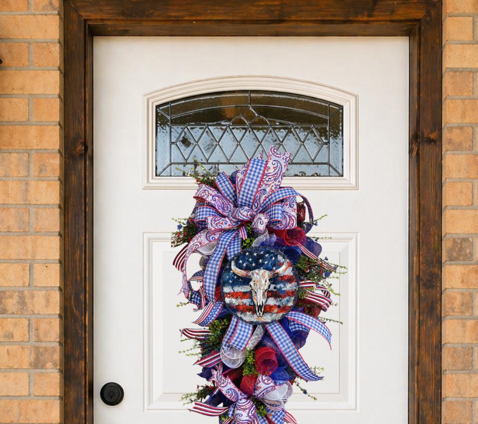 Western Patriotic Swag Wreath, 4th of July Door Hanger, Americana Deco Mesh Wreath, Cowboy Skull Decor, Red White Blue Front Door Swag